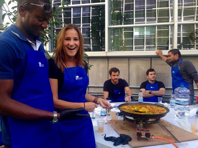 What do you think is a typical Spanish food? Some might say tortilla espanola, jamon iberico, empanadas or gazpacho. I think of paella…So what is paella? It is a rice dish, which originated from a Valencian recipe (hence often called paella Valanciana), often with meat (chicken and rabbit), white beans, vegetables, seasoned with saffron and rosemary. Other types of paellas include seafood or can be mixed (meat and seafood). The thing about that dish is that it’s not easy to make. The recipe might seem straightforward, but if you add too little of this, and too much of that, and if you cook the rice for too long/short or do all the process in a different order, you basically screwed up. A few days ago, as a group bonding exercise or ice-breaker so to speak, our MBA intake was divided into +/- 20 groups of inexperienced paella cooks. It was of course a challenge, and whichever group won, got a trophy, a few bottles of bubbly, and of course the title of the best paella chefs of September 2015 intake. My group was serious about winning. So serious, that we designated two seaoned cooks, and let them do their thing. We also delegated other people for roles such as: bartenders (someone’s gotta bring and drink that beer), dancers, photographers, chef supervisors and rice stirrers to mention a few (team work is what matters, right?!). I personally was a little bit of everything (I think it’s called a GM), but enjoyed taste quality control the most (“rice not cooked enough”, “too much salt”). The outcome was, I must say, pretty tasty. Unfortunately, it was not enough for the grand jury to pick us as the winner, but who cares! At least I know how to make paella now! If you’d like a challenge and make it yourself, click here for the recipe. This weekend I’m traveling to Valencia, the land of paella, so I’m curious to try the original recipe.